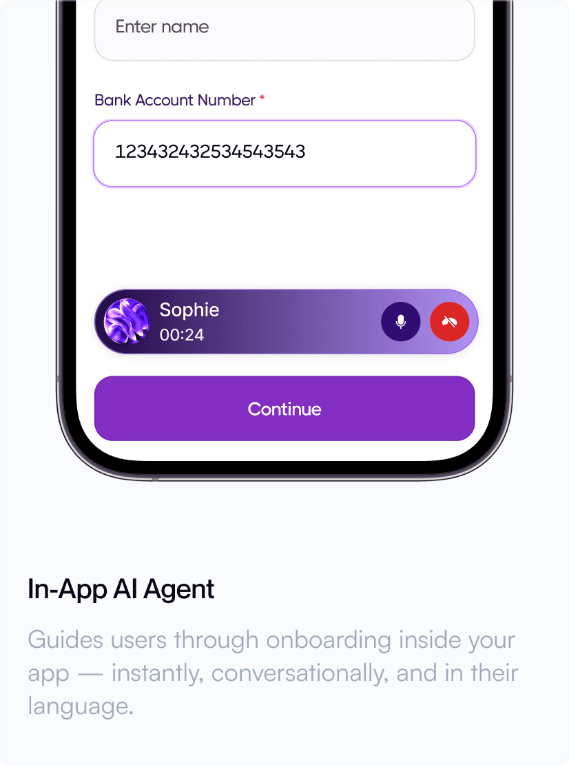 Agent detects confusion, guides users step-by-step, autofills & completes KYC.